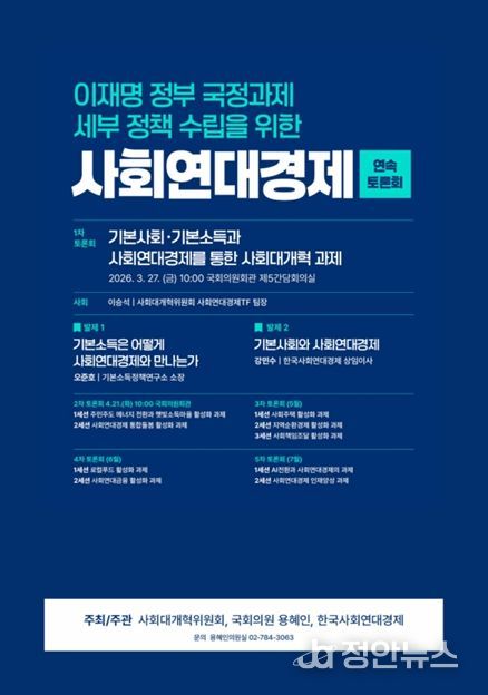 정안뉴스 안정주 기자 | 기본소득당 용혜인 의원은 27일 오전 10시, 국회의원회관 제5간담회의실에서 '이재명 정부 국정과제 세부 정책 수립을 위한 사회연대경제 연속토론회' 중 첫 번째 순서를 개최했다. 사회대개혁위원회, 한국사회연대경제와 공동 주최한 이번 토론회는 사회연대경제기본법 제정이 가시화된 시점에서 구체적 정책과제를 도출하는 첫 자리라는 점에서 의미가 크다.