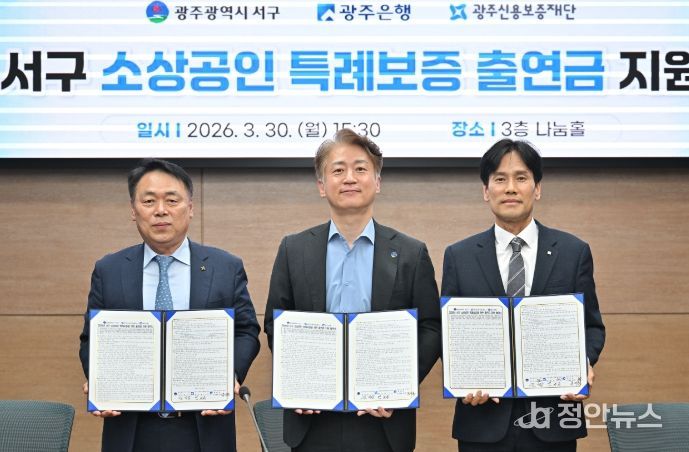 정안뉴스 안정주 기자 | 광주은행은 30일, 광주광역시 서구청에서 김이강 광주광역시 서구청장, 강지훈 광주은행 부행장, 염규송 광주신용보증재단 이사장 및 관계자가 참석한 가운데 ‘서구 소상공인 특례보증 업무협약’을 체결했다고 밝혔다.