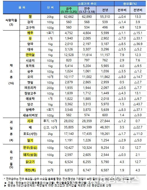 축산물은 가축전염병 발생 및 사육두수 감소로 전년대비 가격이 다소 높은 수준이다. 계란은 기존 정부 할인지원을 활용한 할인행사를 지속하고 닭고기도 4월 2일부터 추가로 실시하여 소비자 부담을 완화할 계획이다.