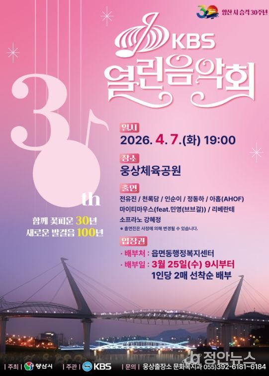 정안뉴스 김재홍 기자 | 양산시가 시 승격 30주년을 기념하고 ‘2026 양산방문의 해’를 널리 알리기 위해 4월 7일(화) 저녁 7시 웅상체육공원 축구장에서‘KBS 열린음악회’를 개최한다고 밝혔다.