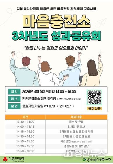 정안뉴스 안정주 기자 | 인천시사회서비스원 소속 인천장애인종합복지관은 정신장애인 지원 사업 ‘마음충전소’ 3년 성과공유회를 연다고 31일 밝혔다.