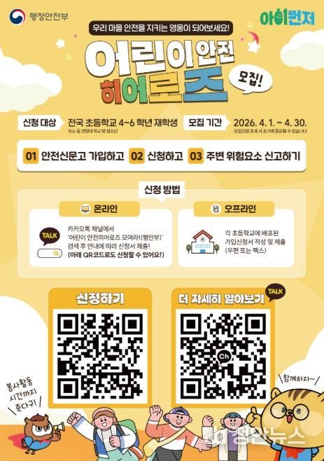정안뉴스 안정주 기자 | 행정안전부는 4월 1일부터 30일까지 ‘어린이 안전히어로즈’ 신규 대원을 모집한다.
