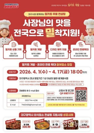 정안뉴스 안정주 기자 | 대구광역시는 지역 외식업소의 경쟁력을 높이고 온라인 시장 진출을 돕기 위한 ‘2026년 외식업소 밀키트 개발 컨설팅 지원사업’ 참여업소를 오는 4월 17일까지 모집한다.