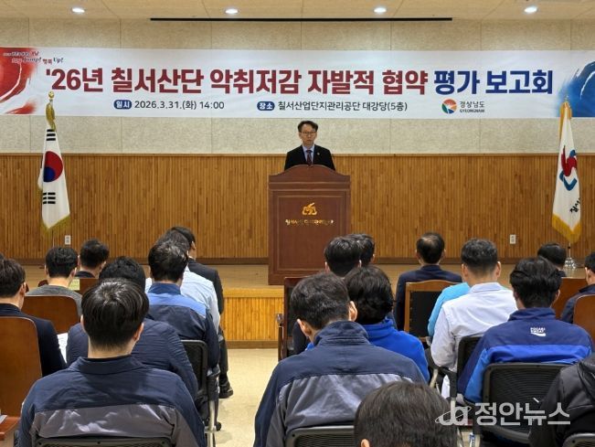 정안뉴스 김재홍 기자 | 경상남도는 31일 오후 2시, 칠서산단 복지회관 대강당에서 협약 참여기업 관계자와 시군 환경담당 공무원 등 100여 명이 참석한 가운데 ‘칠서산단 악취저감 자발적 협약 2026년('25년 실적) 이행 평가 보고회’를 개최했다고 밝혔다.