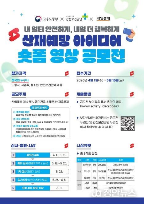 정안뉴스 안정주 기자 | 고용노동부는 한국산업안전보건공단, ㈜매일경제신문사와 함께 국민 누구나 참여할 수 있는 산재예방 아이디어 숏폼 영상 공모전를 개최한다.