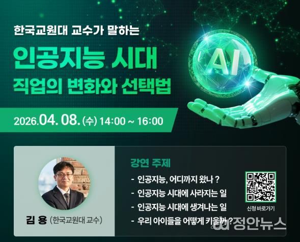 강연은 한국교원대학교 김용 교수가 맡아 인공지능 기술의 현재 수준과 함께 변화하는 직업 세계를 분석하고, 사라지거나 새롭게 등장하는 직업군의 흐름을 설명할 예정이다.
