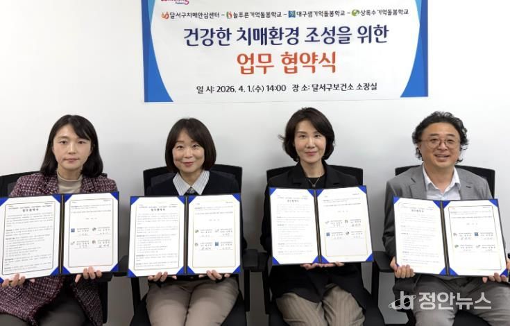 정안뉴스 안정주 기자 | 대구 달서구는 지난 1일 늘푸른기억돌봄학교, 대구샘기억돌봄학교, 상록수기억돌봄학교와 업무협약을 체결하고, 인지저하 및 경증치매 어르신을 위한 통합돌봄 체계 구축에 나선다.