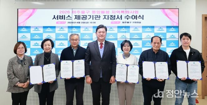 정안뉴스 안정주 기자 | 인천 미추홀구는 3일 구청장실에서 ‘2026년 미추홀구 통합 돌봄 지역특화 사업을 수행할 서비스 제공기관 5곳에 지정서를 수여했다고 밝혔다.