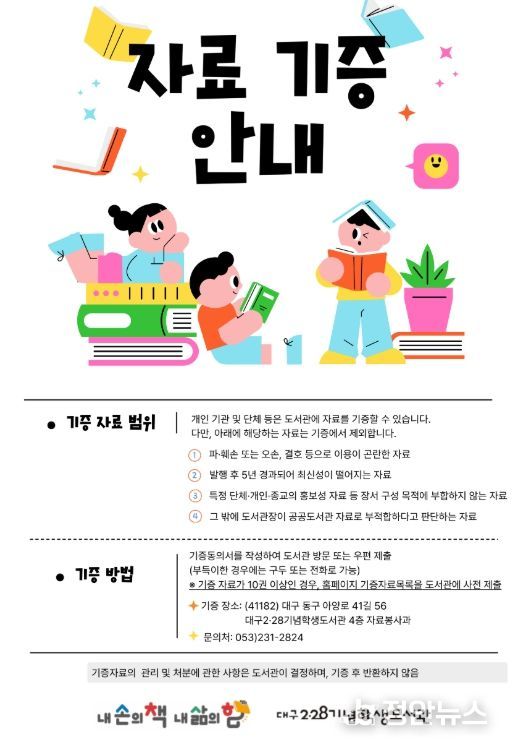자료 기증을 희망하는 시민은 인근 대구시교육청 10개 공공도서관 자료봉사과(실)에 문의하면 자세한 안내를 받을 수 있다.
