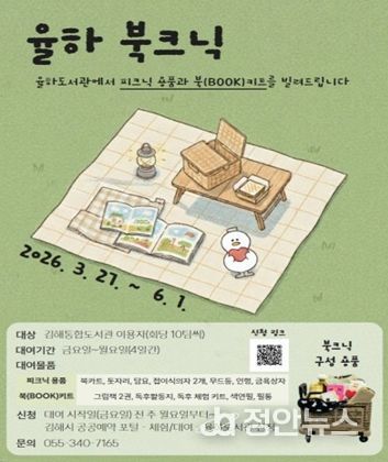 정안뉴스 김재홍 기자 | 김해율하도서관은 봄을 맞아 시민들이 야외에서 편안하게 독서를 즐길 수 있도록 피크닉 용품과 독서 키트를 대여하는 ‘율하 북크닉’ 대여 서비스를 오는 6월 1일까지 운영한다고 밝혔다.