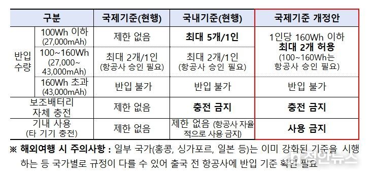기존 국제기준에서는 일반인이 가장 많이 사용하는 100Wh(27,000mAh) 이하 보조배터리에 대한 반입 수량 제한이 없어, 국내 기준을 마련하여 1인당 5개까지 제한했으나, 앞으로는 신설된 국제기준에 따라 보조배터리(Power bank)는 1인당 최대 2개(160Wh/43,000mAh 이하)로 반입이 제한된다.