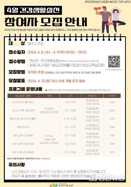 정안뉴스 안정주 기자 | 연수구 송도건강생활지원센터는 오는 8일부터 2일간 ‘건강생활실천 프로그램 2기’ 참여자를 모집한다.