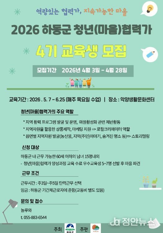 정안뉴스 김재홍 기자 | 하동군은 지역 활력 회복과 청년 일자리 창출을 위해 추진 중인 ‘청년(마을)협력가 양성과정’의 제4기 교육생을 오는 4월 28일까지 모집한다고 밝혔다.