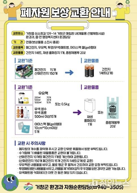 정안뉴스 김재홍 기자 | 거창군은 자원순환 실천과 올바른 분리배출 문화 정착을 위해 폐자원보상 교환 사업을 확대 시행한다고 9일 밝혔다.