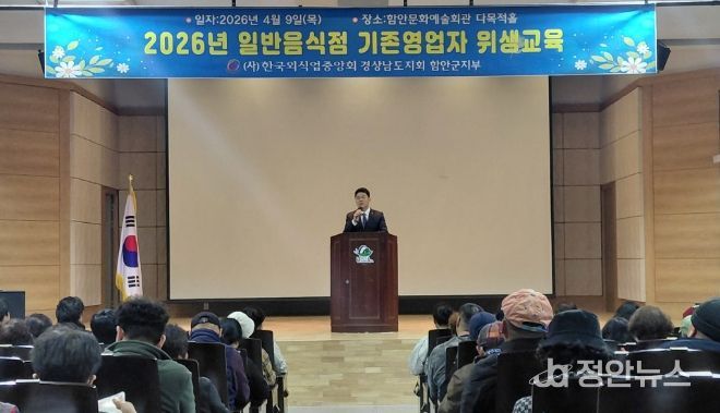 정안뉴스 김재홍 기자 | 함안군은 지난 9일부터 10일까지 이틀간 함안문화예술회관과 칠원읍사무소에서 관내 일반음식점 영업자 300여 명을 대상으로 ‘2026년도 기존 영업자 식품 위생교육’을 실시했다고 밝혔다.