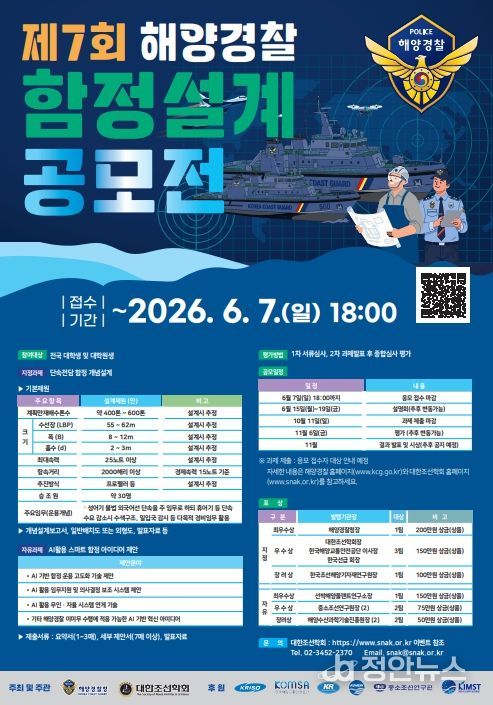 정안뉴스 안정주 기자 | 해양경찰청은 국민 참여형 공모전인 '제7회 해양경찰 함정설계 공모전'을 개최한다고 밝혔다.