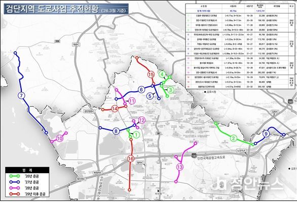 첫째, 검단지역에서는 검단양촌IC~봉수대로, 금곡동~대곡동 구간 등 총 16개 도로사업이 추진된다. 총연장 40.73km, 사업비는 약 1조 6,137억 원에 달한다.