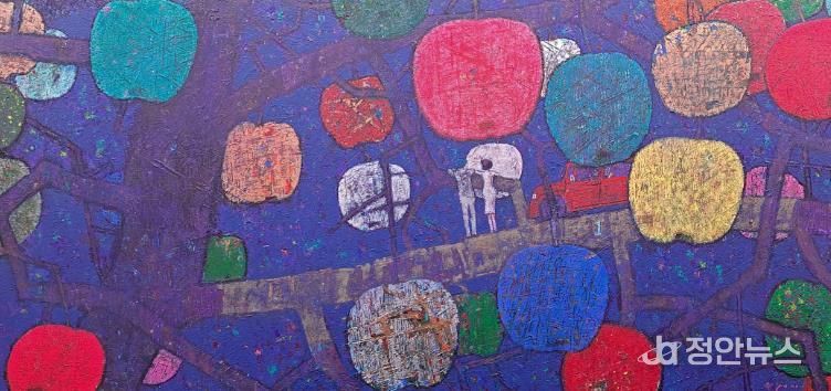 작가는 사과를 생명과 우주가 응축된 존재로 바라보며, 둥근 하늘과 둥근 땅 사이에 머무는 상징적 형상으로 확장한다.
