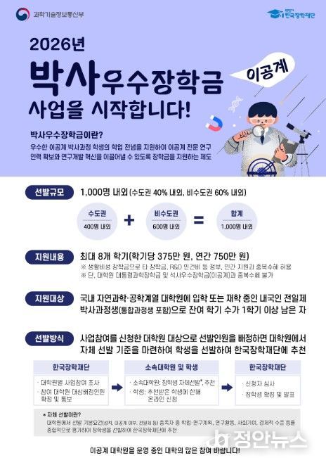 정안뉴스 안정주 기자 | 과학기술정보통신부와 한국장학재단은 2026년도 이공계 박사 우수장학금 사업을 올해 처음으로 시행한다고 밝혔다. 이공계 박사 우수장학금은 사업 참여를 신청한 대학원의 소속 학생 중 장학생을 선발하며, 대학원의 사업 참여 신청 기간은 4월 14일부터 4월 20일까지이다.