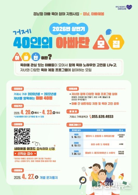 정안뉴스 김재홍 기자 | 거제시는 아빠의 적극적인 육아 참여를 유도하고, 가족중심의 건강한 양육문화를 확산하기 위해 2026년 상반기 '거제 40인의 아빠단'을 모집한다.