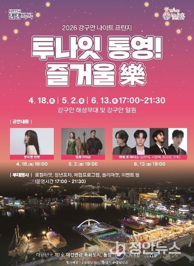 정안뉴스 김재홍 기자 | 통영시는 오는 18일 강구안 해상무대 및 강구안 일원에서 '2026 강구안 나이트 프린지, 투나잇 통영 즐거울 樂'의 첫 공연을 개최한다.