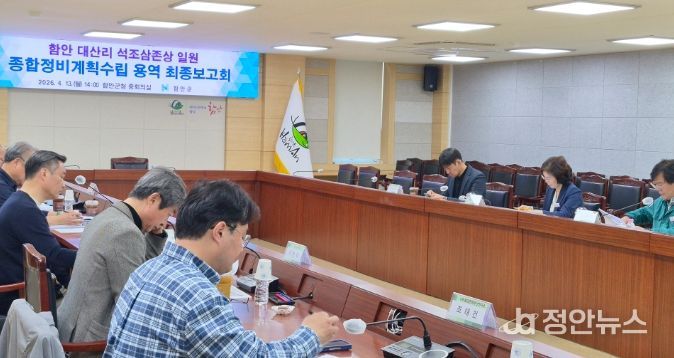 정안뉴스 김재홍 기자 | 함안군은 지난 13일 군청 별관 3층 중회의실에서 ‘함안 대산리 석조삼존상 일원 종합정비계획 수립 용역’ 최종보고회를 개최하고 국가유산의 체계적 보존과 활용을 위한 종합정비계획안을 최종 점검했다고 밝혔다.
