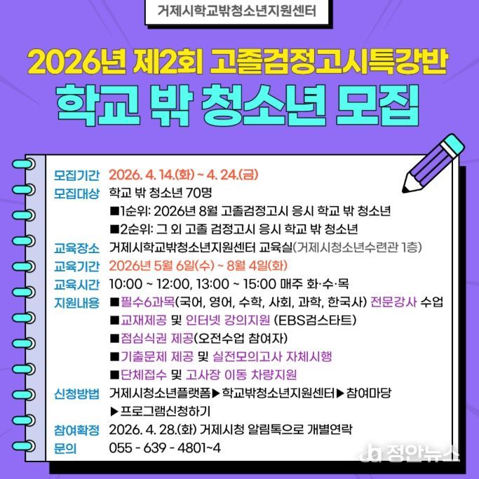 정안뉴스 김재홍 기자 | 거제시학교밖청소년지원센터에서는 2026년도 제2회 고등학교 졸업학력 검정고시 대비 검정고시특강반에 참석할 학교 밖 청소년을 모집한다.