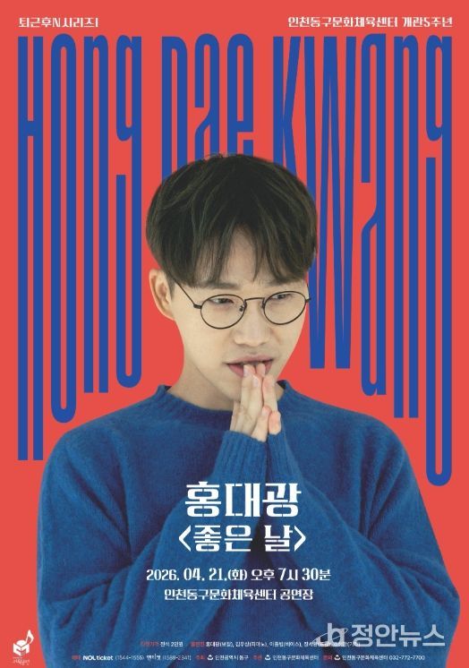 정안뉴스 안정주 기자 | 인천동구문화체육센터는 업무에 지친 직장인을 대상으로 오는 21일 오후 7시30분 홍대광의 '좋은 날' 공연을 개최한다고 밝혔다.