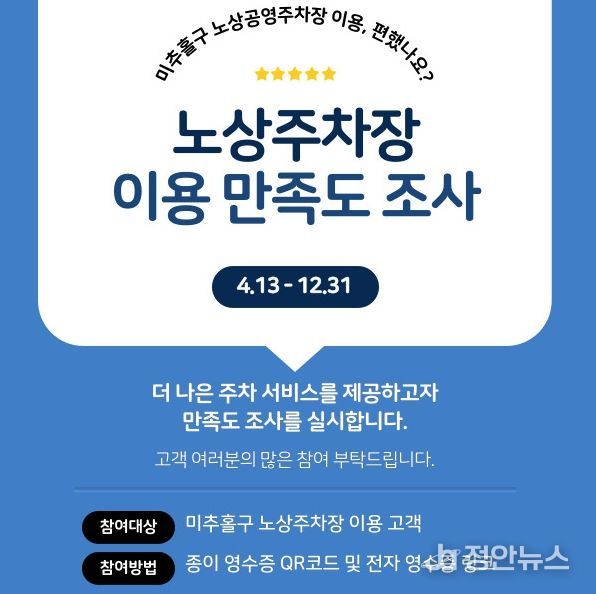 정안뉴스 안정주 기자 | 인천 미추홀구시설관리공단은 노상공영주차장 이용 고객의 다양한 의견을 수렴하고 서비스 품질을 향상하기 위해 ‘고객 만족도 조사’를 실시한다고 밝혔다.