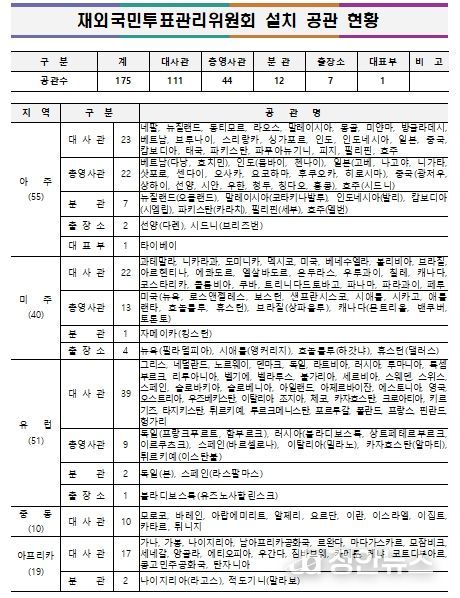 전쟁․폭동 등으로 인해 주재국 정세가 불안한 ▲주아프가니스탄이슬람공화국대사관 ▲주우크라이나대사관 ▲주레바논공화국대사관 ▲주리비아대사관 ▲주사우디아라비아왕국대사관 ▲주젯다총영사관 ▲주두바이총영사관 ▲주예멘공화국대사관 ▲주오만왕국대사관 ▲주이라크공화국대사관 ▲주이라크공화국아르빌분관 ▲주쿠웨이트국대사관 ▲주수단공화국대사관 등 13개 공관에는 재외국민투표관리위원회를 설치하지 않는다.