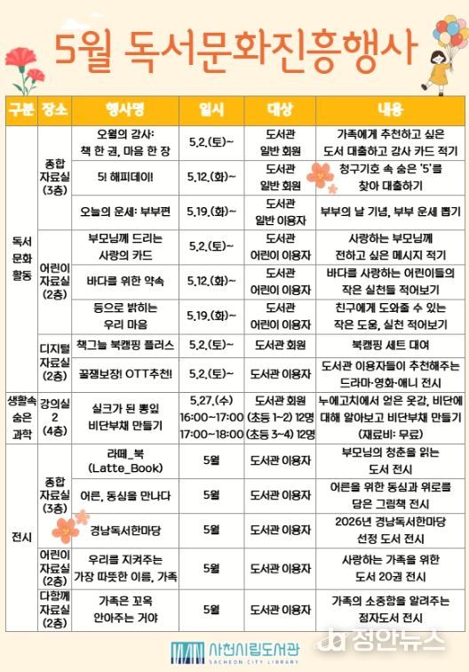 정안뉴스 김재홍 기자 | 사천시립도서관은 가정의 달을 맞아 가족의 의미를 되새기고 시민들의 자발적인 독서 참여를 유도하기 위한 ‘5월 독서문화진흥행사’를 운영한다.