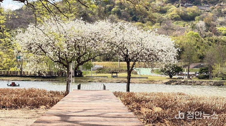 잔잔한 호수 위로 순백의 꽃망울이 은은하게 피어나 고요한 수면과 어우러지며, 마치 한 폭의 수채화를 펼쳐놓은 듯한 봄 풍경을 선사하고 있다.