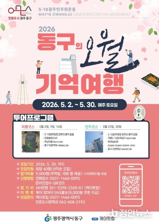 정안뉴스 안정주 기자 | 광주 동구는 제46주년 5·18민주화운동을 기념해 5월 한 달 동안 기념 투어 프로그램인 ‘동구의 오월 기억여행’을 운영한다고 밝혔다.