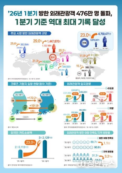 정안뉴스 안정주 기자 | 문화체육관광부는 올해 1분기(1~3월) 한국을 방문한 외국인 관광객이 약 476만 명을 기록하며, 3월 중동사태 발생에도 불구하고 1분기 기준 역대 최대 규모를 달성했다고 밝혔다. 이는 2025년 같은 기간 대비 23% 증가한 수치이며, 특히 3월에는 외래객 약 206만 명이 방한해 월별 기준으로도 최대 실적을 경신했다. ‘케이-컬처’의 세계적 인기와 더불어 민관의 적극적인 외래관광객 유치 노력이 결실을 본 것으로 분석된다.