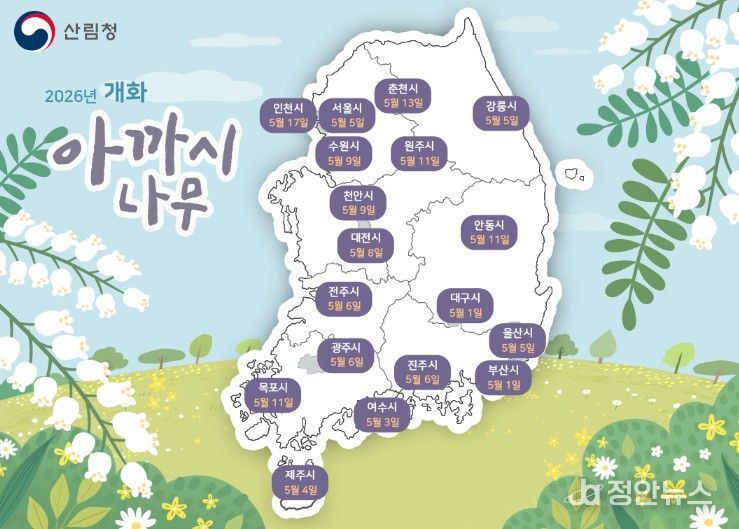 지난 겨울 기온이 평년보다 0.6℃ 높았고 4~5월 기온도 상승할 것으로 전망되면서, 올해 아까시나무와 마가목의 개화 시기는 전년보다 전국 평균 2~4일 앞당겨질 것으로 예상된다. 이번 개화 예측지도는 산림지역을 기준으로 작성돼 실제 개화 시기는 지역에 따라 차이가 나타날 수 있다.