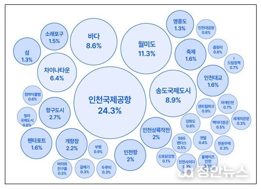 특히 인천 연상이미지는 ‘인천국제공항’(24.3%), ‘월미도’(11.3%), ‘송도국제도시’(8.9%), ‘바다’(8.6%) 등으로, 국제도시·공항도시, 해양·섬 관광도시 이미지를 확보했다는 점에서 의미 있는 성과로 평가된다.