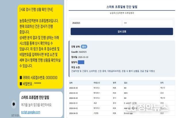 민원인이 조회할 수 있는 정보는 ▲검사 단계(접수, 검사 중, 통보 등) ▲부검 소견 ▲바이러스·세균·기생충 검사, 항생제 감수성 검사 결과 등이다.
