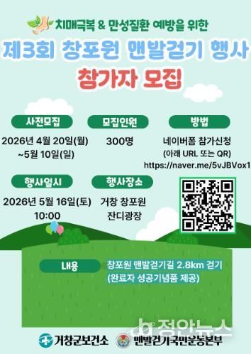 이정헌 보건소장은 “이번 행사를 통해 군민들이 일상 속 걷기 실천을 자연스럽게 이어갈 수 있는 계기가 되기를 바란다”며 “가족, 이웃과 함께 창포원에서 건강한 시간을 보내시길 바란다”고 말했다.
