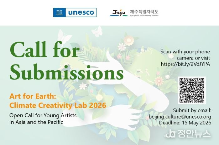정안뉴스 안정주 기자 | 제주특별자치도가 유네스코(UNESCO)와 새롭게 공동 추진 중인 ‘Je Create: 지속가능한 미래를 위한 문화와 혁신’ 사업의 일환으로, ‘Art for Earth: 기후 창의성 랩 2026’에 참여할 청년예술가를 오는 5월 15일까지 공개 모집한다.