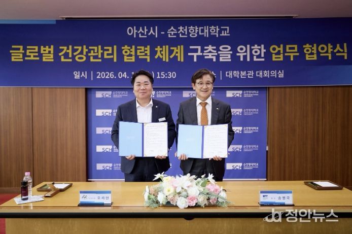 정안뉴스 안정주 기자 | 아산시와 순천향대학교가 지난 15일 순천향대학교 본관 3층 대회의실에서 ‘글로벌 건강관리 협력체계 구축’을 위한 업무협약을 체결했다.