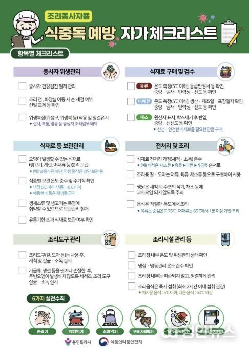 또 칼과 도마는 어류‧육류‧채소류 등으로 구별해 쓰고, 사용한 칼과 도마 등은 반드시 세척‧소독해야 한다고 했다. 조리한 음식은 최소 2시간 이내에 먹을 것도 권장했다.