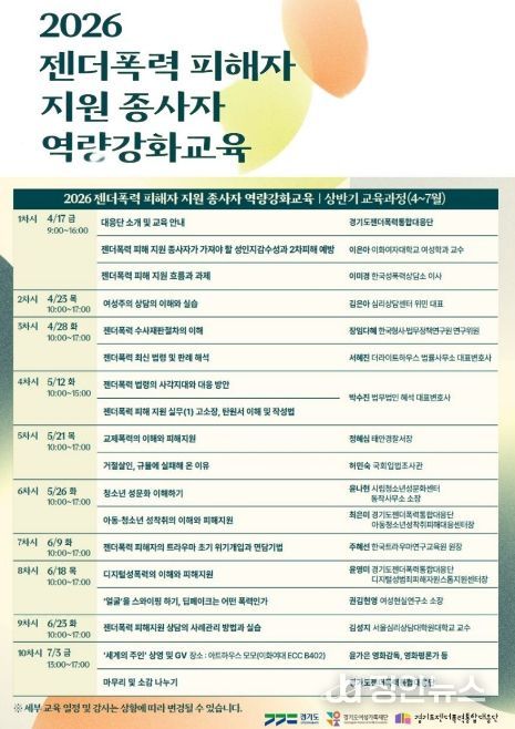 정안뉴스 안정주 기자 | 경기도와 경기도젠더폭력통합대응단이 17일 도내 젠더폭력 피해 지원 현장 종사자들의 전문성 향상을 위한 ‘2026 역량강화 교육’ 상반기 과정을 시작하며 현장 대응력 강화에 나섰다.