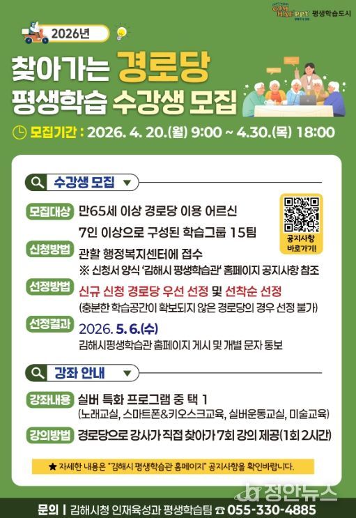 정안뉴스 김재홍 기자 | 김해시는 평생학습 사각지대 해소와 어르신의 활기찬 노후 지원을 위해 오는 5월부터 ‘2026년 찾아가는 경로당 평생학습 프로그램’을 운영한다고 17일 밝혔다.