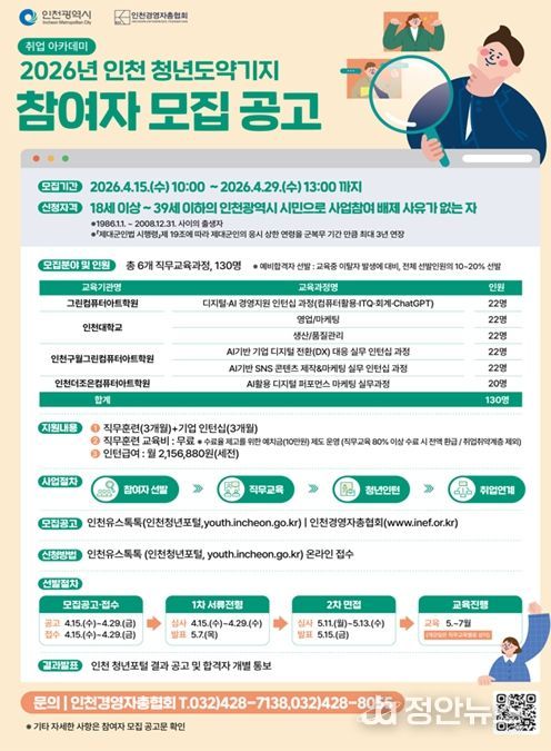 정안뉴스 안정주 기자 | 인천광역시는 청년의 취업역량을 강화하고 지역기업이 필요로 하는 실무형 인재를 양성하기 위해 ‘2026 인천 청년도약기지’ 사업 참여자 130명을 4월 15일부터 4월 29일까지 모집한다고 밝혔다.