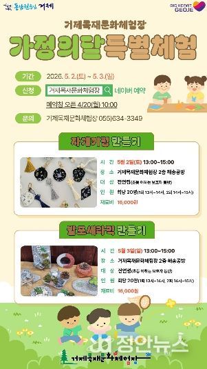 정안뉴스 김재홍 기자 | 거제시 목재문화체험장(동부면 거제중앙로 325, 거제자연휴양림 내 위치)은 가정의 달을 맞아 오는 5월 2일과 5월 3일 이틀간 『자개키링&발포세라믹 만들기 특별체험』을 운영한다고 밝혔다.