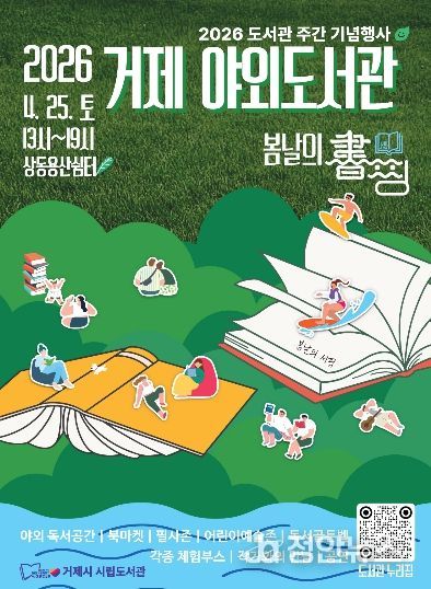 정안뉴스 김재홍 기자 | 거제시 시립도서관은 4월 도서관 주간을 맞아 오는 4월 25일 상동동 용산쉼터에서 시민 참여형 야외 독서문화 행사인 2026 거제 야외도서관 『봄날의 書(서)핑』을 개최한다.