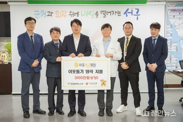 정안뉴스 안정주 기자 | 인천 서구는 지난 16일 바로서구병원(대표원장 유범석·김훈철)으로부터 취약계층 지원을 위한 양곡(500만 원 상당)을 전달받았다고 밝혔다.