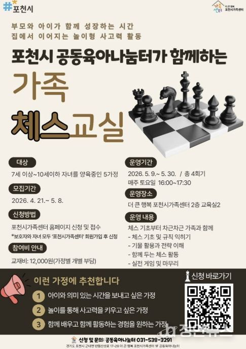 정안뉴스 안정주 기자 | 포천시 더 큰 행복 포천시가족센터는 공동육아나눔터 상시 프로그램의 일환으로 아동의 논리적 사고력 향상과 부모-자녀 간 긍정적 상호작용을 지원하기 위해 가족 참여형 체스 프로그램 '가족 체스 교실'을 운영한다고 밝혔다.