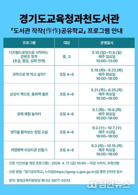 정안뉴스 안정주 기자 | 경기도교육청과천도서관이 학생들의 자기주도 학습 역량과 창의적 사고력 함양을 위해 ‘도서관 작작(作作) 공유학교’를 운영한다.
