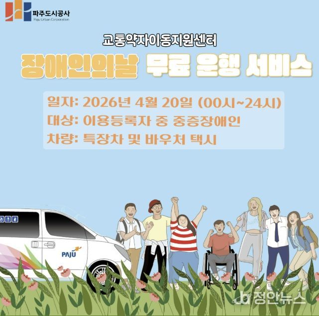 정안뉴스 안정주 기자 | 파주도시공사 교통약자이동지원센터에서는 오는 4월 20일 장애인의 날을 맞아 교통약자를 위한 무료 운행 서비스를 실시한다.